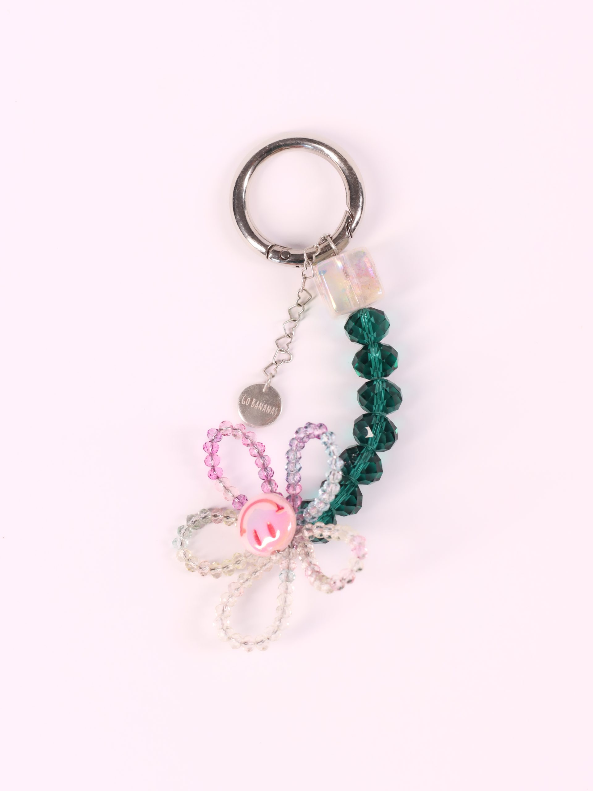 Add a playful and stylish touch to your everyday essentials with this charming flower-shaped keychain! Made with delicate bead, a cheerful smiley center, and finished with a silver chain and GoBananas tag, it’s perfect for your keys, bag, or even as a statement accessory on jeans.