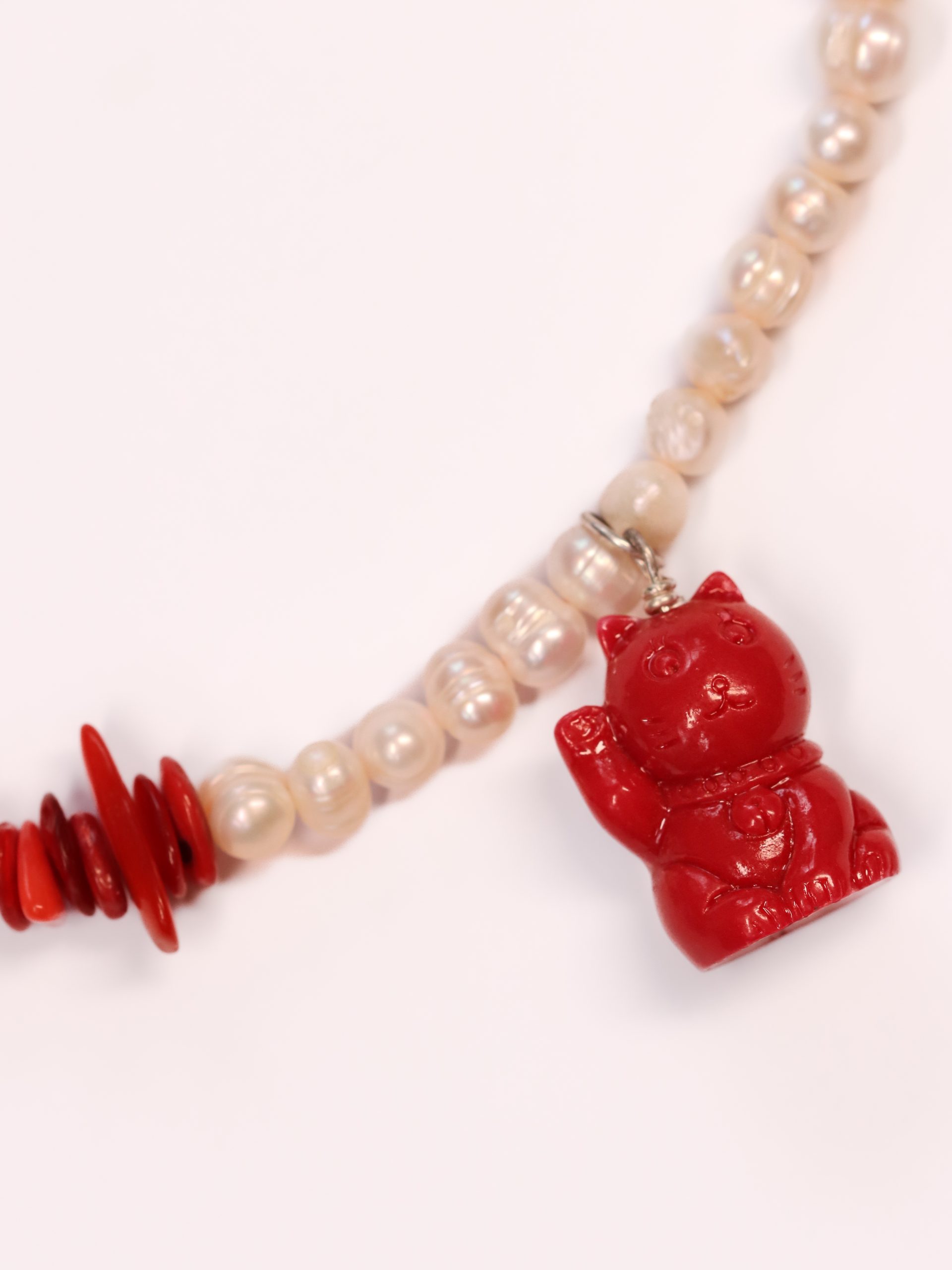 🪸 Material: pearls, red coral beads, acrylic lucky cat pendant, adjustable 925 sterling silver chain, lobster and tag