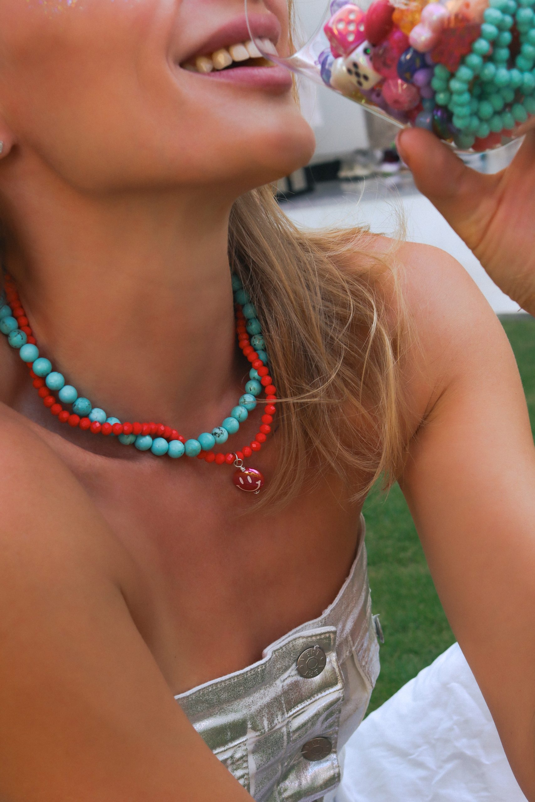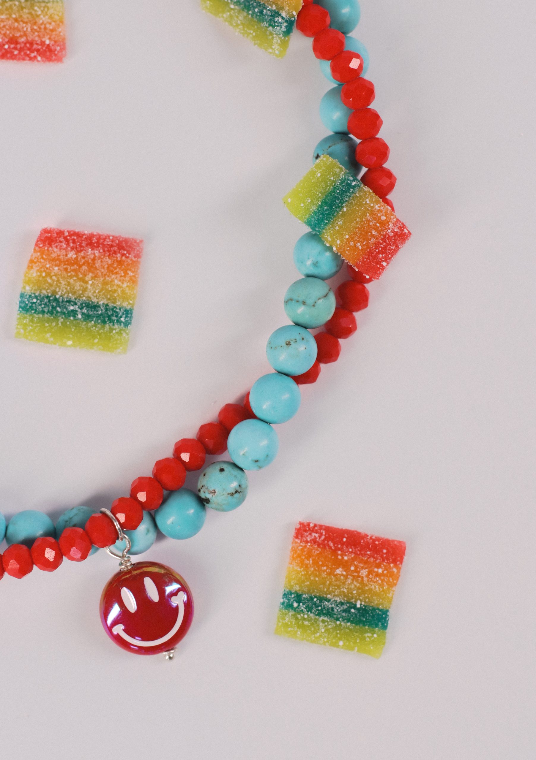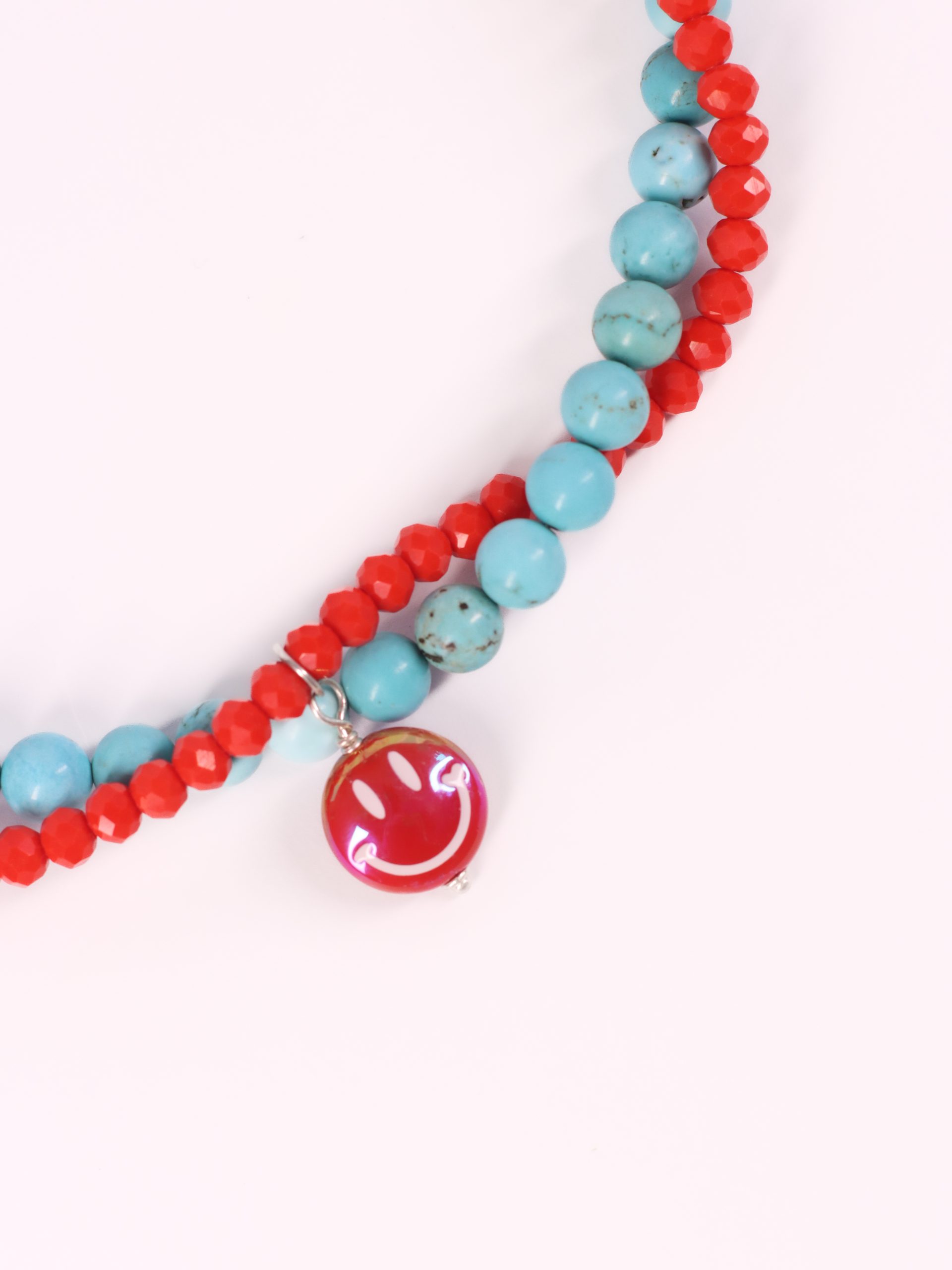 This necklace combines classic blue agate with the vibrant energy of red beads. The acrylic smiley charm blends classic elegance with a touch of youthful fun.